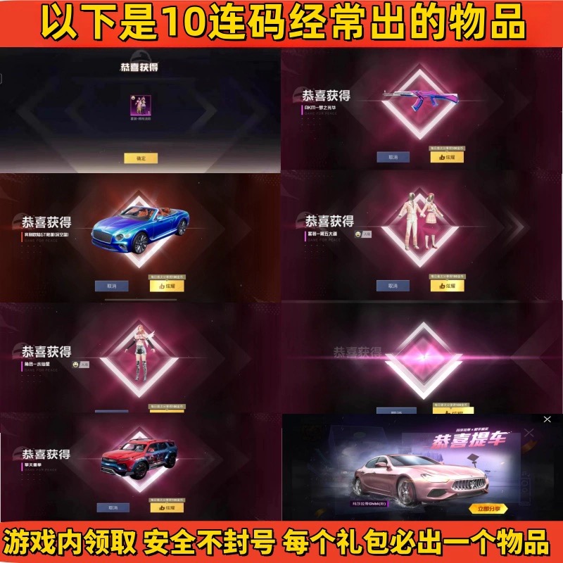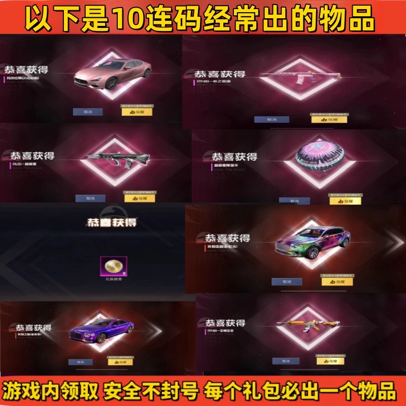 和平精英手游兑/换码车币玛莎拉蒂螳螂火箭少女宝马通用车皮/肤...¥243.00